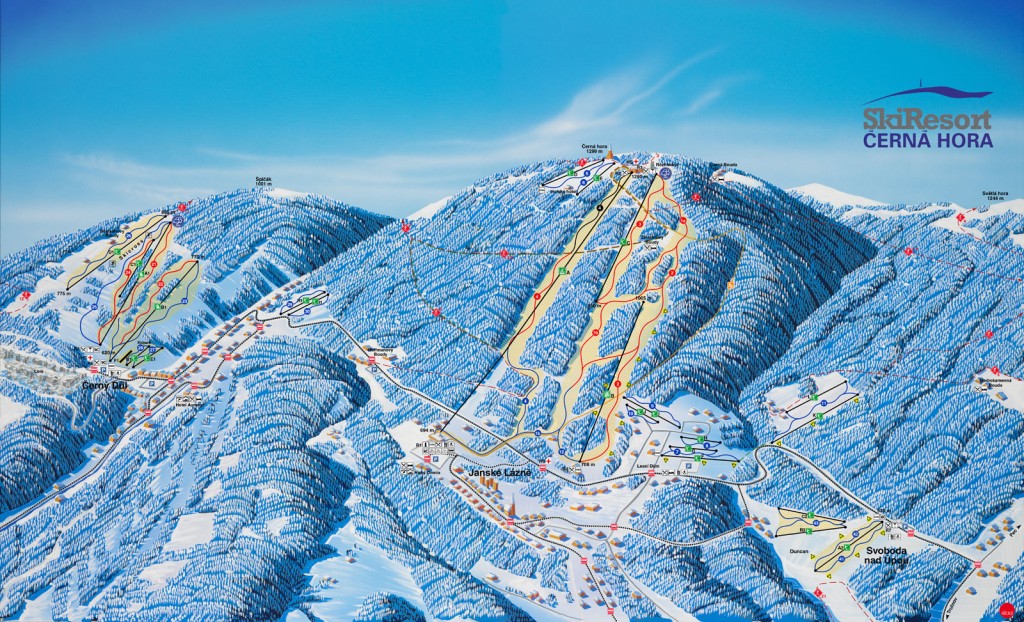 Ośrodek narciarski Černá Hora – Janské Lázně (600 – 1260 m n.p.m.) dysponuje jedyną 8-osobową kolejką gondolową w Czechach oraz trasami zjazdowymi o wszystkich stopniach trudności, które należą do najdłuższych w kraju (długość 3 km). Dla miłośników narciarstwa biegowego regularnie przygotowywane jest ponad 50 km szlaków; tor saneczkowy o długości 3,5 km. Trasy sztucznie oświetlane i naśnieżane. Parking płatny dla samochodów i ma ograniczoną pojemność.